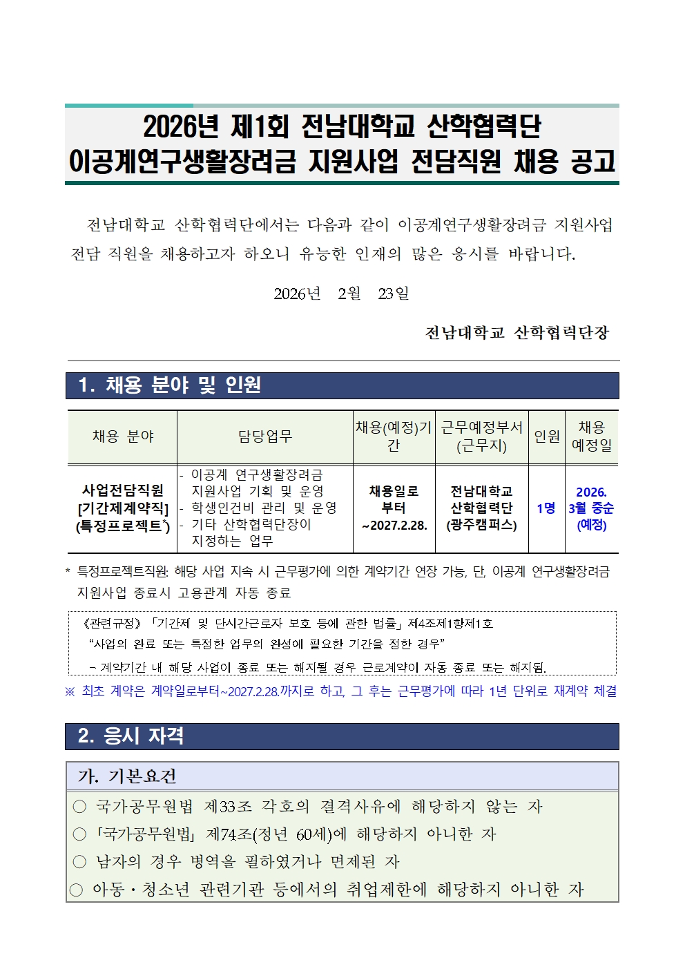2026년 제1회 전남대학교 산학협력단 이공계연구생활장려금 지원사업 전담직원 채용 공고