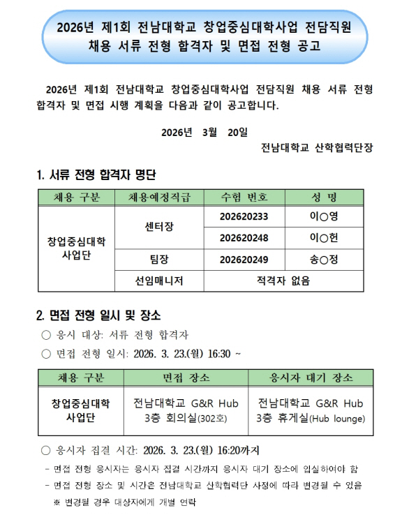 2026년 제1회 전남대학교 창업중심대학사업 전담직원 채용 서류전형 합격자 및 면접전형 공고